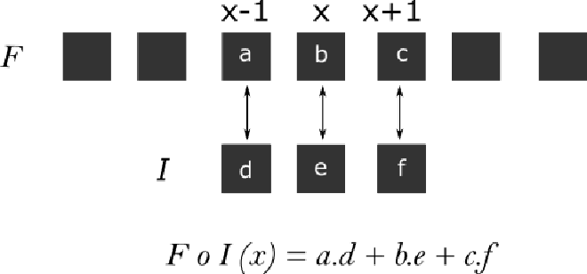 correlation of two signals : $$ F \circ I(x) = \sum_{i=-N}^{N} F(i)I(x+i) $$